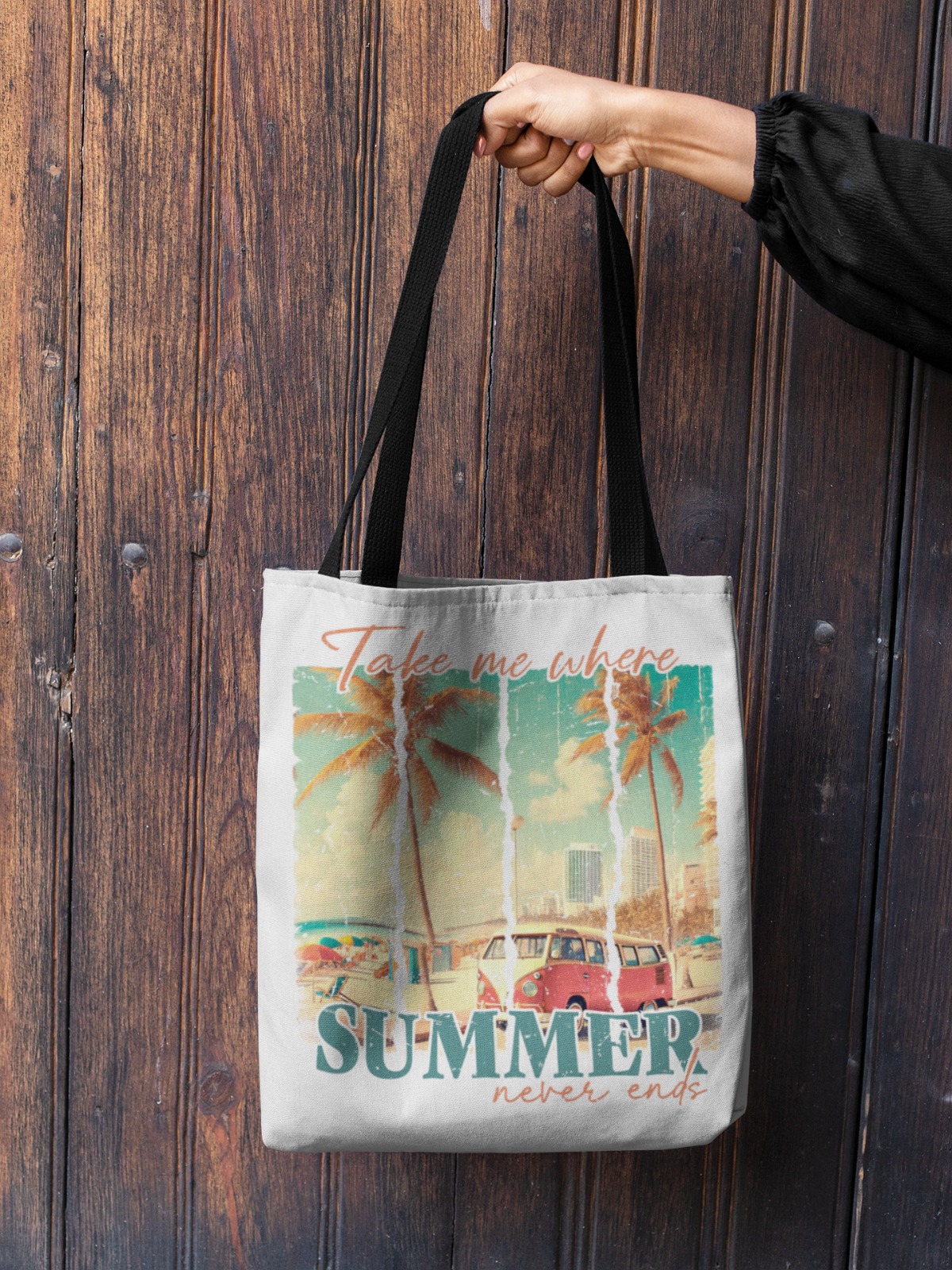 Capture the spirit of endless sunshine with this beach-inspired canvas tote. Featuring a vintage-style graphic of palm trees, a seaside view, and the playful phrase “Take me where summer never ends”, this bag is your go-to for warm-weather vibes all year long.