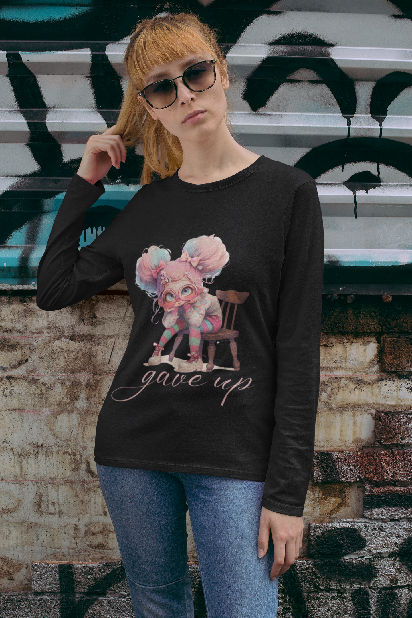 Break the rules in soft style with our “Gave Up” Pastel Rebel Long Sleeve T-Shirt. Featuring an eye-catching character in dreamy pastel tones and bold expression, this tee speaks to the unapologetic soul. Whether it’s a mood, a moment, or just your favorite aesthetic — this shirt captures it perfectly.