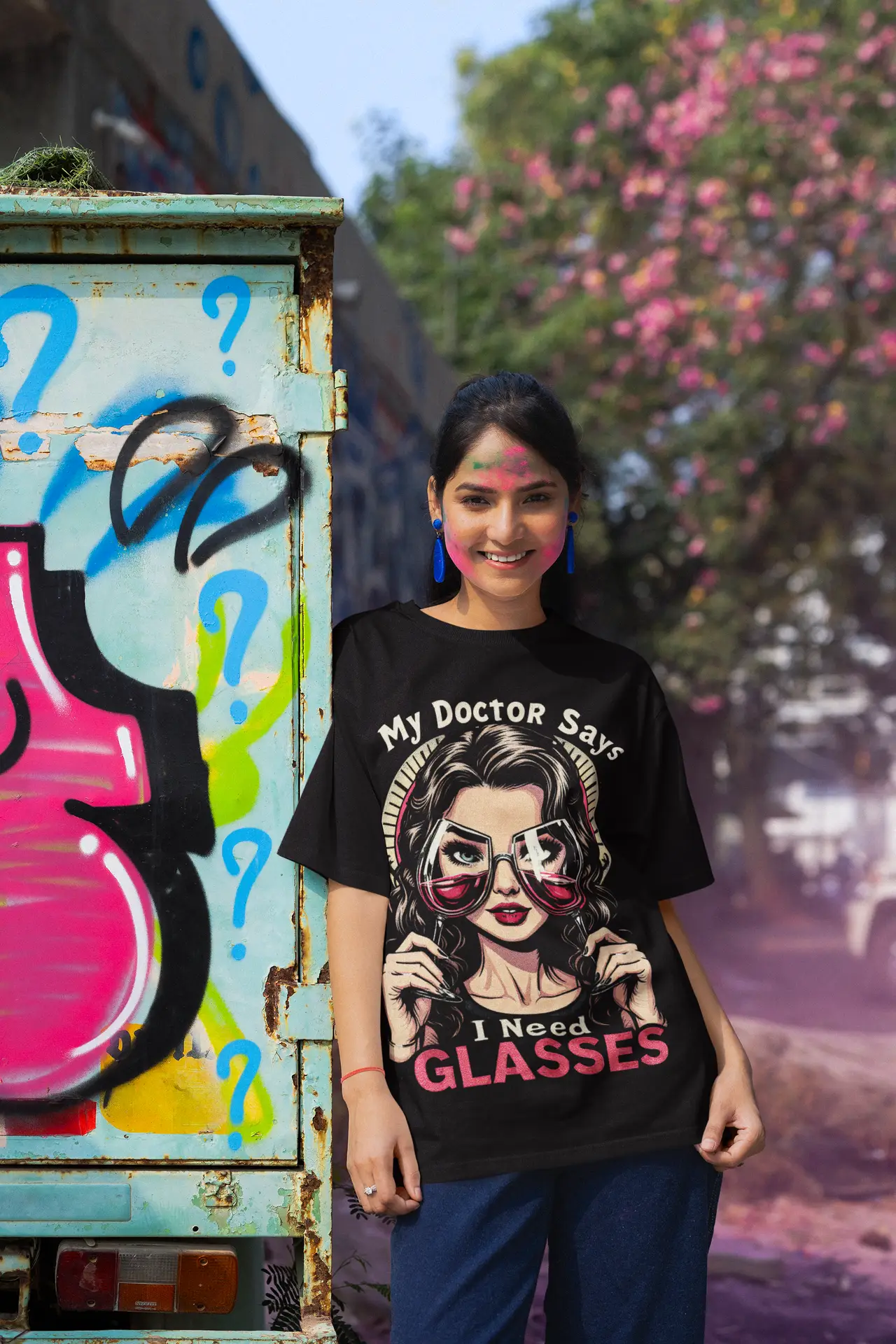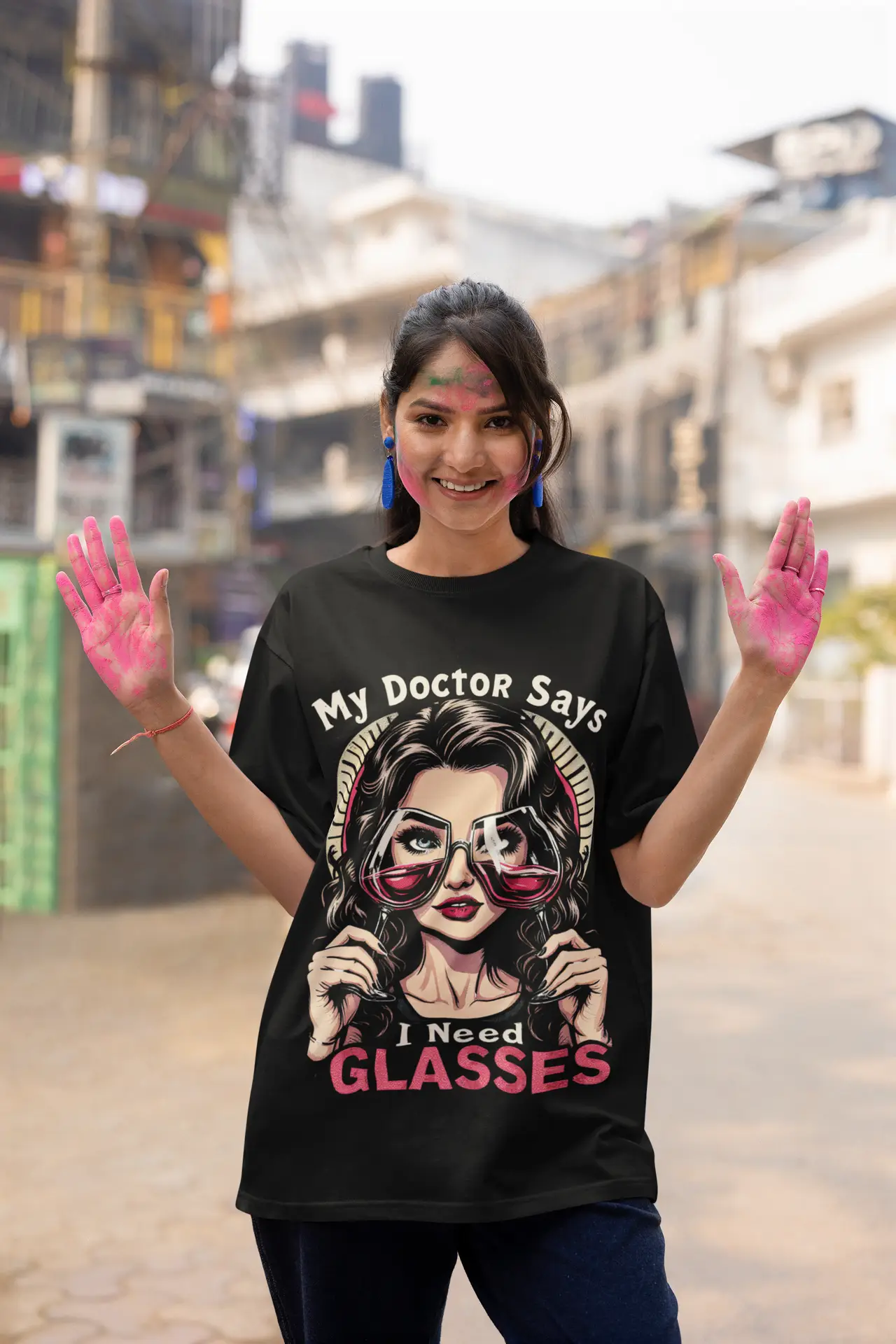 Show off your playful side with eye-catching t-shirt features a retro-chic illustration of a stylish woman holding two glasses of red wine like eyeglasses, paired with the witty phrase: “My Doctor Says I Need Glasses.”