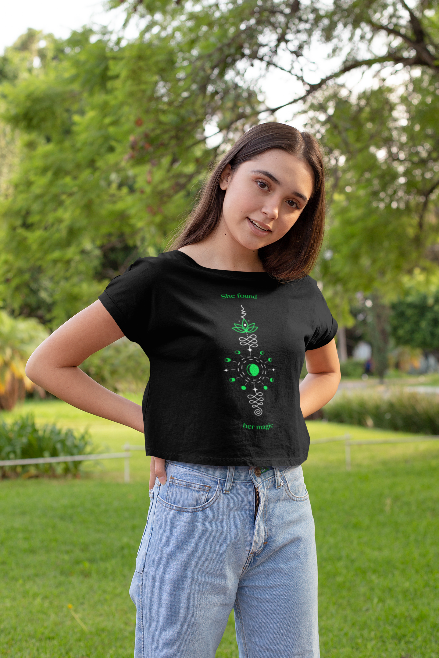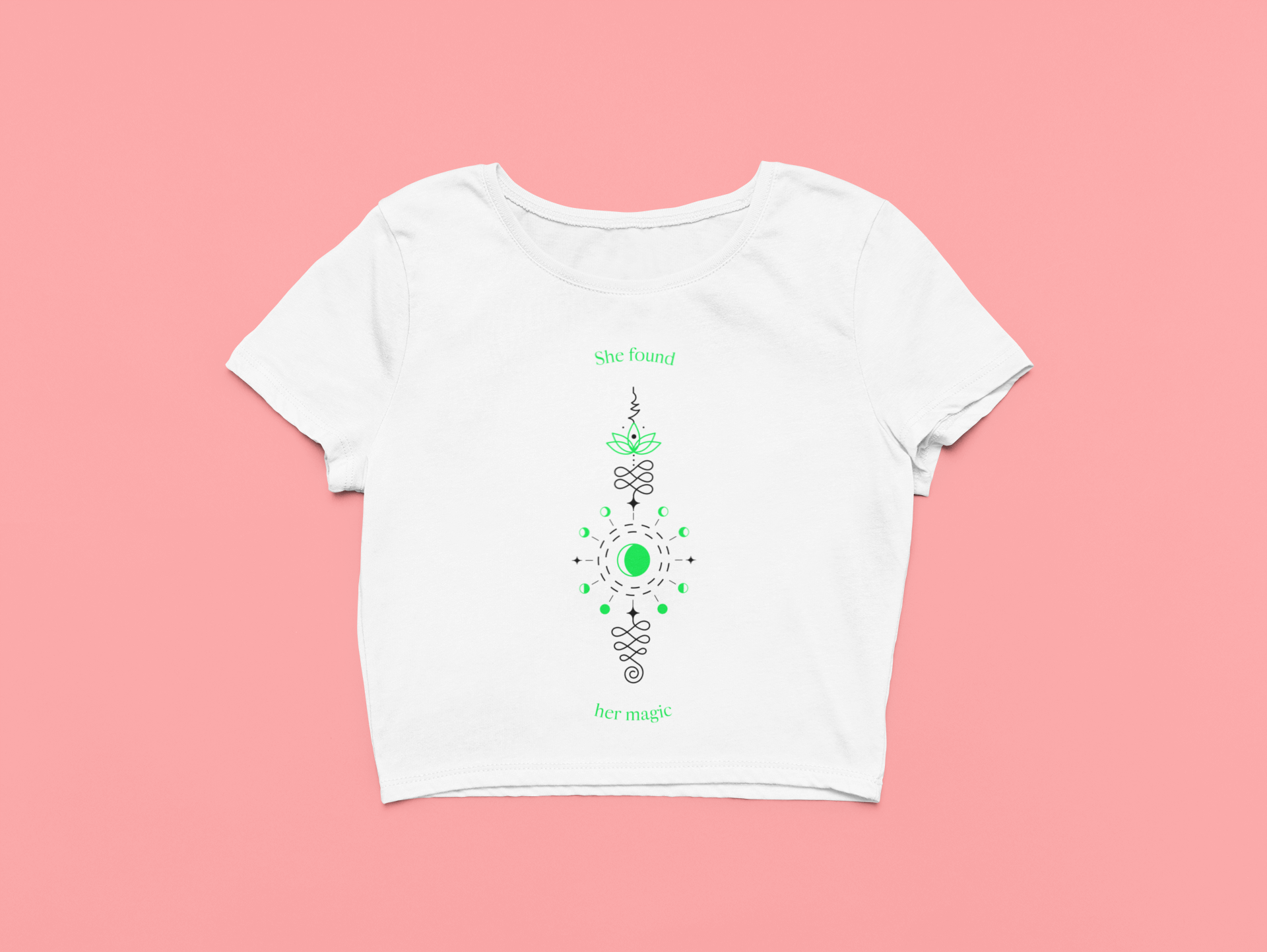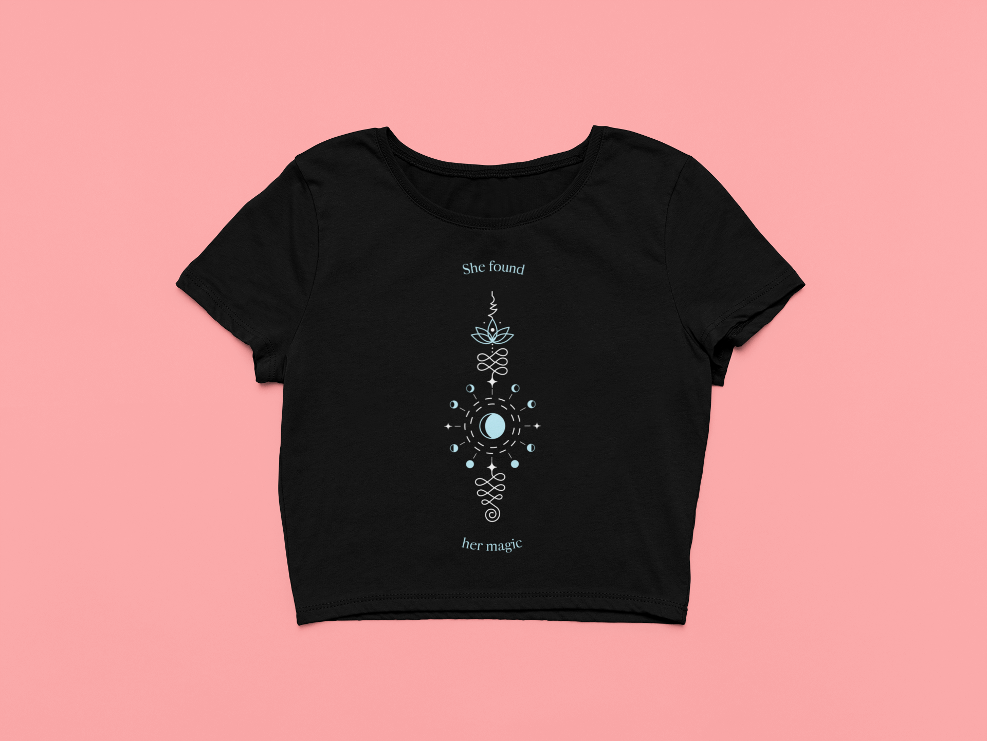 This isn’t just a crop tee — it’s a reminder of inner power. Featuring a delicate sacred geometry design and the phrase “She found her magic”, this piece blends comfort with intention.