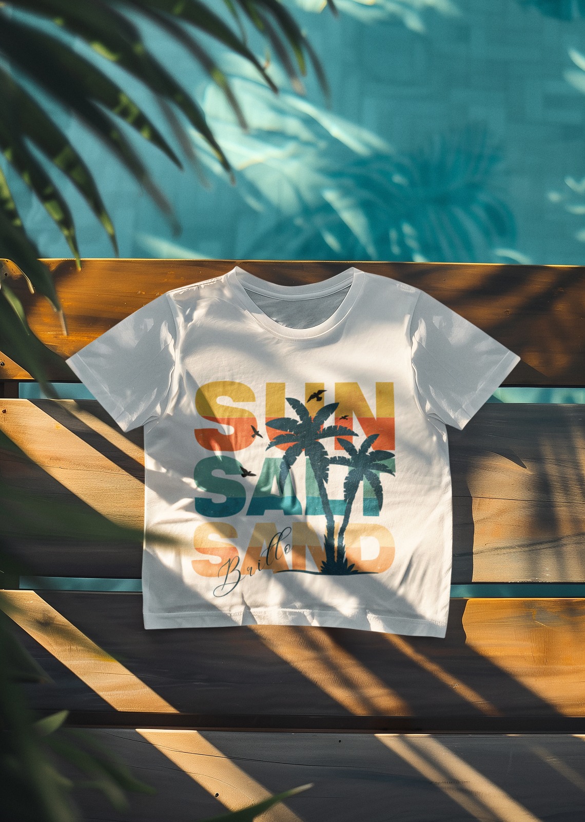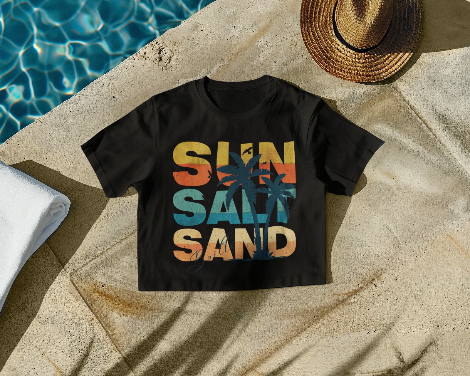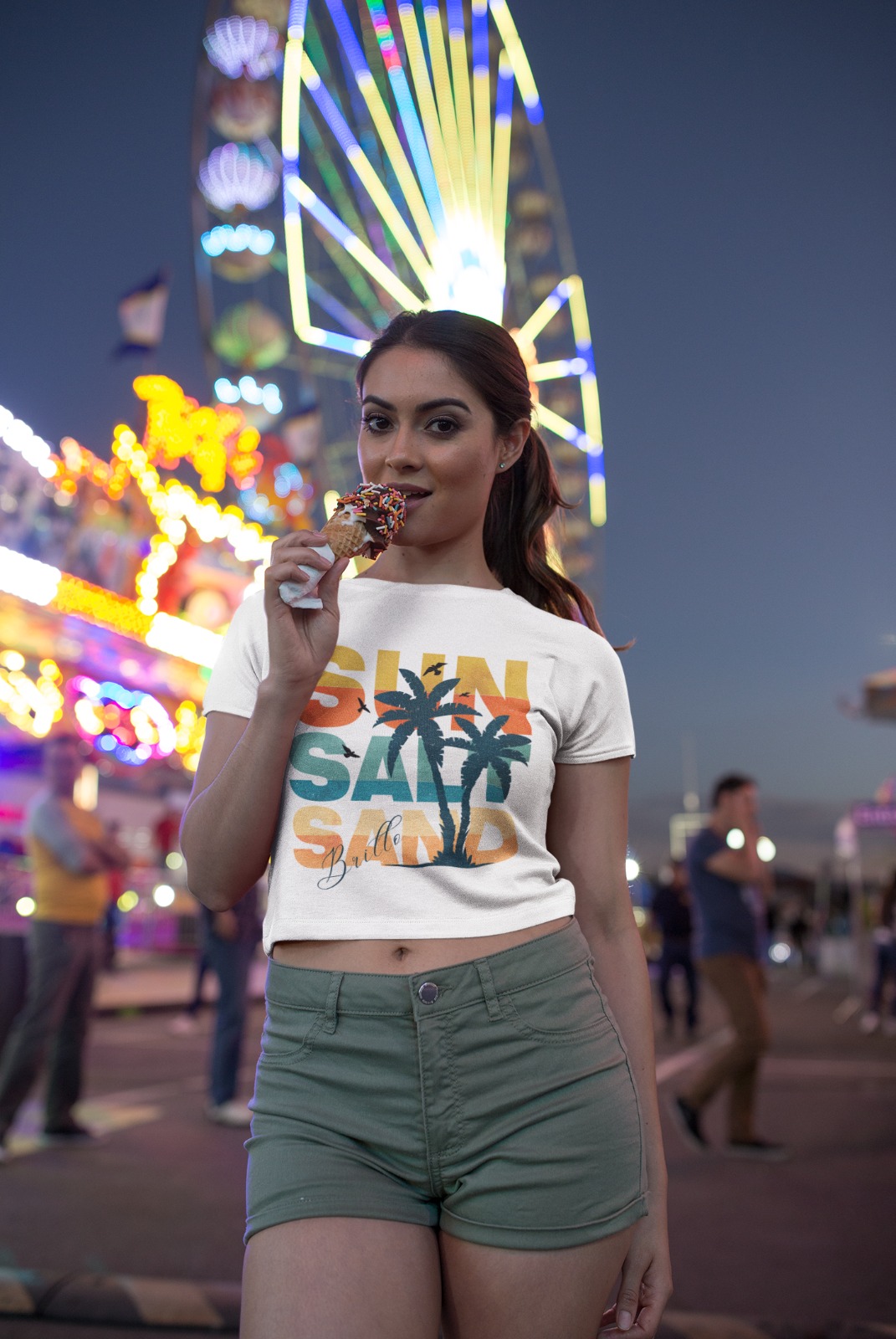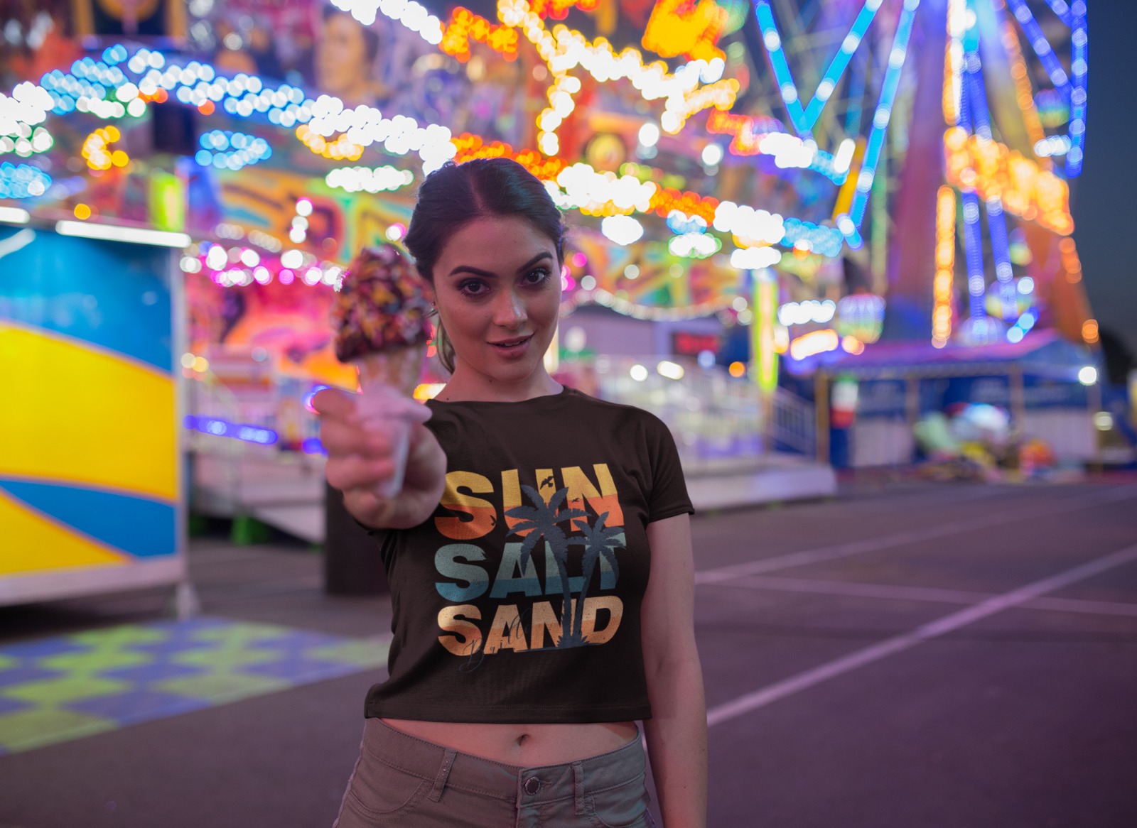 Channel those golden hour vibes with this beachy-chic SUN SAND SAND crop top. With its tropical color palette and palm tree graphic, this tee screams summer fun — from boardwalk strolls to late-night carnival rides.